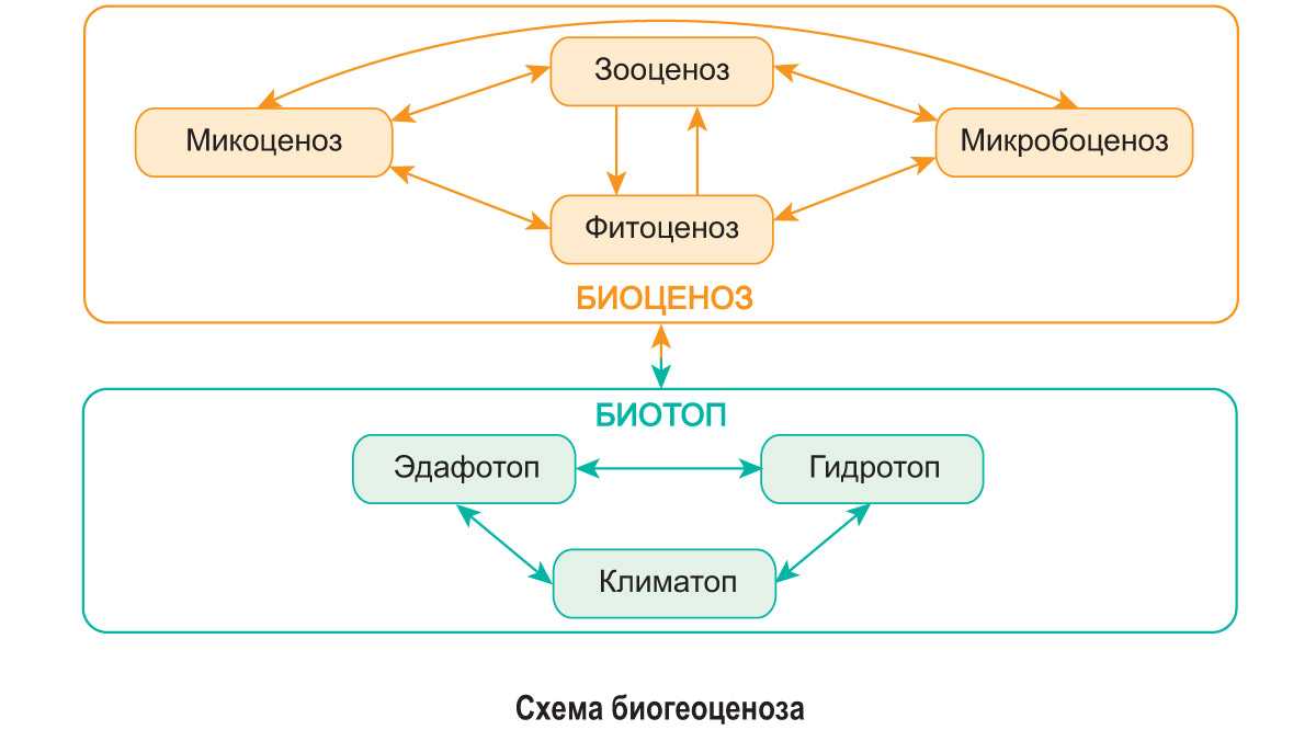 Как видно из приведенного определения, биогеоценоз включает две структурные части — биоценоз и биотоп. Каждая из этих частей состоит из определенных компонентов, которые между собой взаимосвязаны.