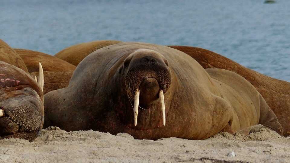 Морж ныряет в ледяную воду Северного Ледовитого океана, чтобы найти пищу, в основном — моллюсков на морском дне. Под кожей у моржа имеется жировая прослойка, достигающая 15 см. Конечности моржа приспособлены для плавания — он гребет ими, как веслами. При помощи длинных клыков морж соскребает моллюсков с камней, а также выбирается на берег, упираясь ими в лед.