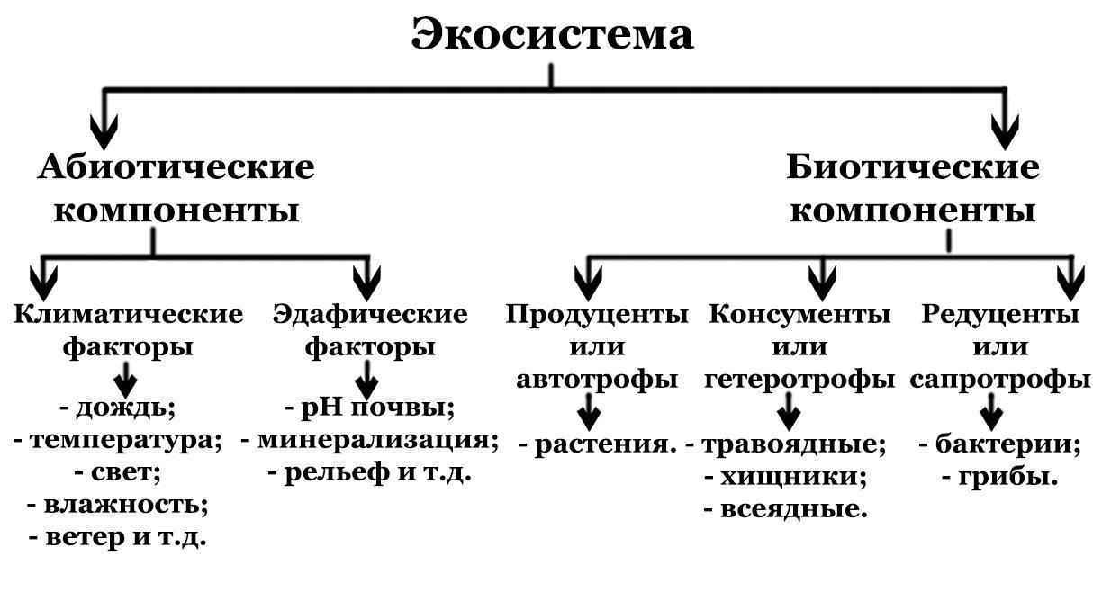 Каждая экосистема состоит из абиотических и биотических компонентов: