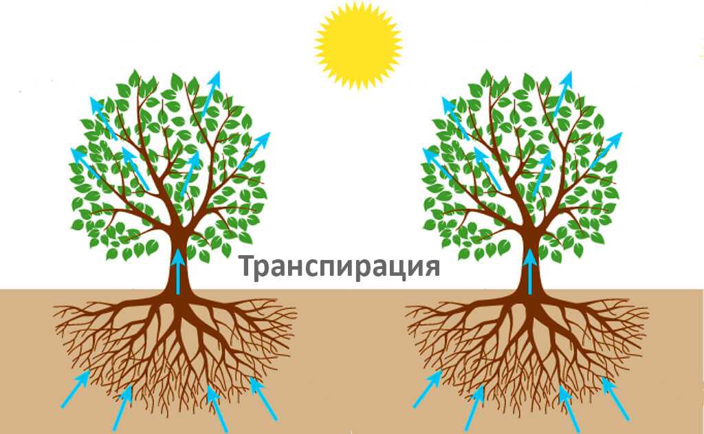 Транспирируя воду корнями, стволом и ветками, деревья испаряют ее через листья. Для растения такой процесс полезен тем, что охлаждает его части в жару. Каждое растение имеет свои показатели вытягивания и испарения воды. Составлять этот показатель может 10-600 литров в сутки.
