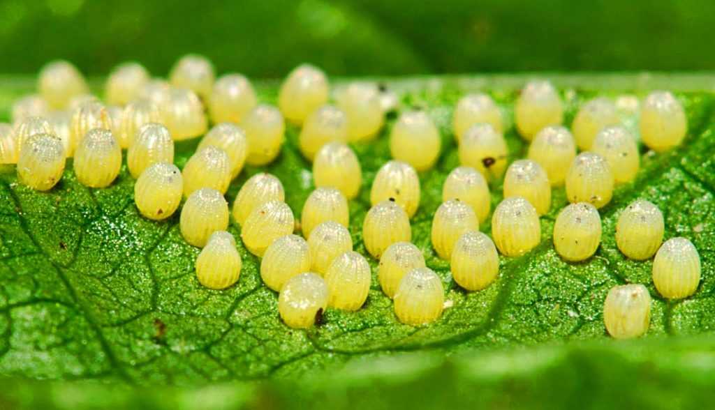 Найдя подходящее, по мнению самки, питательное и укромное место, она отложит на нижнюю сторону листа яйца и улетит. Через 8 – 15 дней, из яиц выбираются личинки-гусеницы, и тут же принимаются поедать листья. Гусеница ест, а значит, растет, несколько раз линяет.