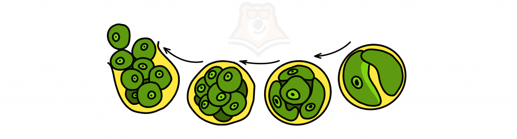 | Почему взрослая хламидомонада всегда погибает при “родах”?При бесполом размножении цитоплазма внутри клетки делится много раз митозом, разрывая целлюлозную оболочку. Получается, взрослая водоросль никогда не выживает при появлении “детей”.Вышедшие из клетки гаметы попарно сливаются, образуя зиготу, которая далее делится мейозом на 4 зооспоры. Каждая из зооспор затем превращается во взрослую водоросль. |