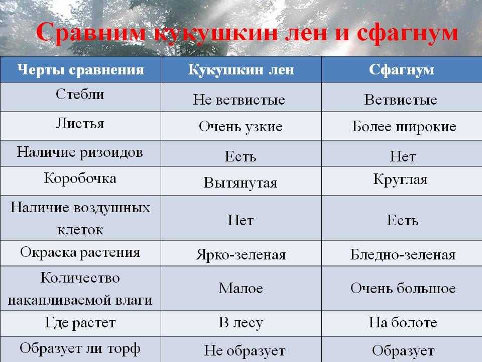 5. Сфагнум продуцирует карболовую кислоту, которая обладает бактерицидными свойствами, а Кукушкин Лён не имеет таких свойств.