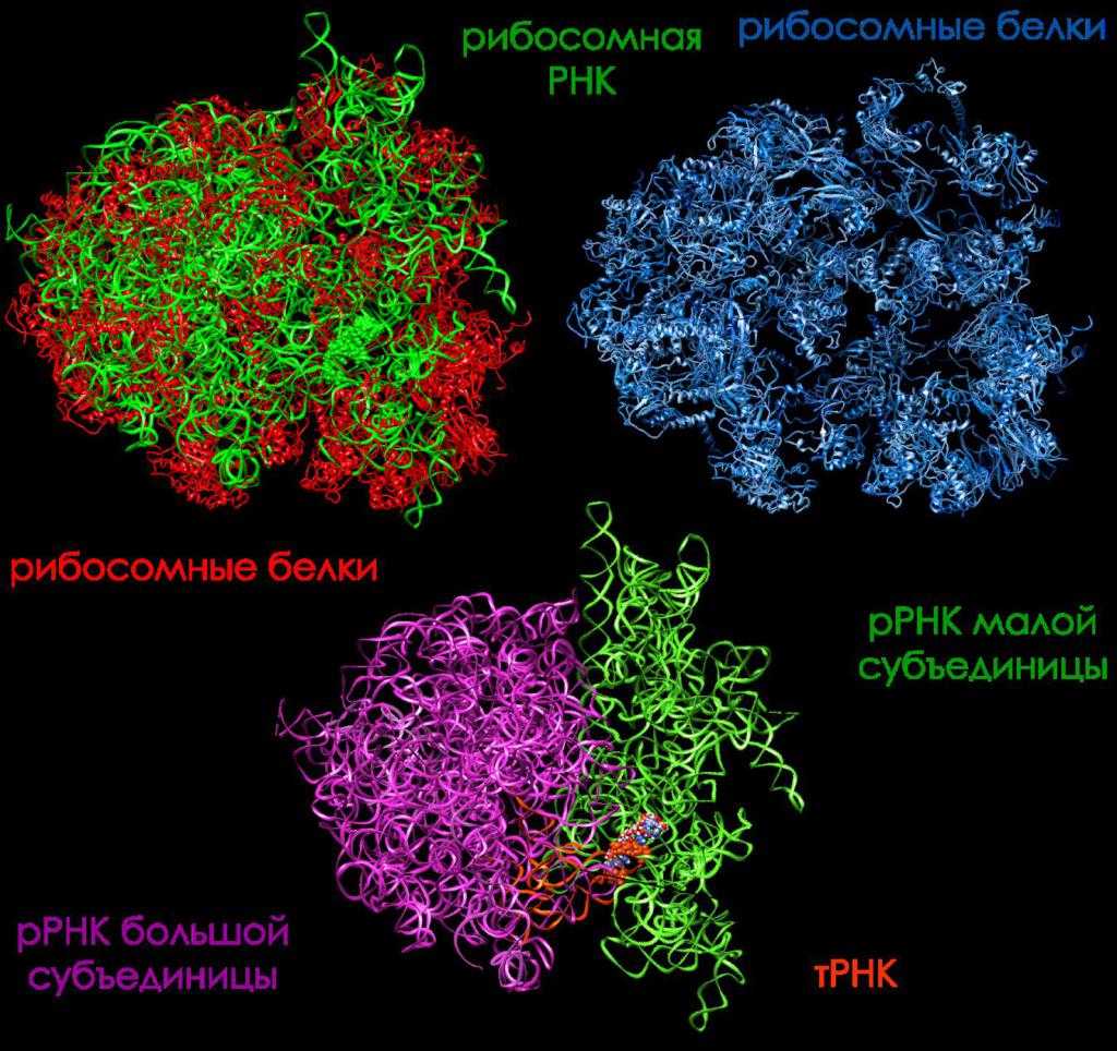 Основу рибосомы – комплекса, обеспечивающего белковый синтез, составляют две длинные рРНК, которые образуют субчастицы рибосомы. Синтезируются они совместно в виде одной пре-рРНК, которая затем в ходе процессинга разделяется. В большую субчастицу входит также низкомолекулярная рРНК, синтезируемая с отдельного гена. Рибосомные РНК обладают плотно упакованной третичной структурой, которая служит каркасом для белков, присутствующих в рибосоме и выполняющих вспомогательные функции.