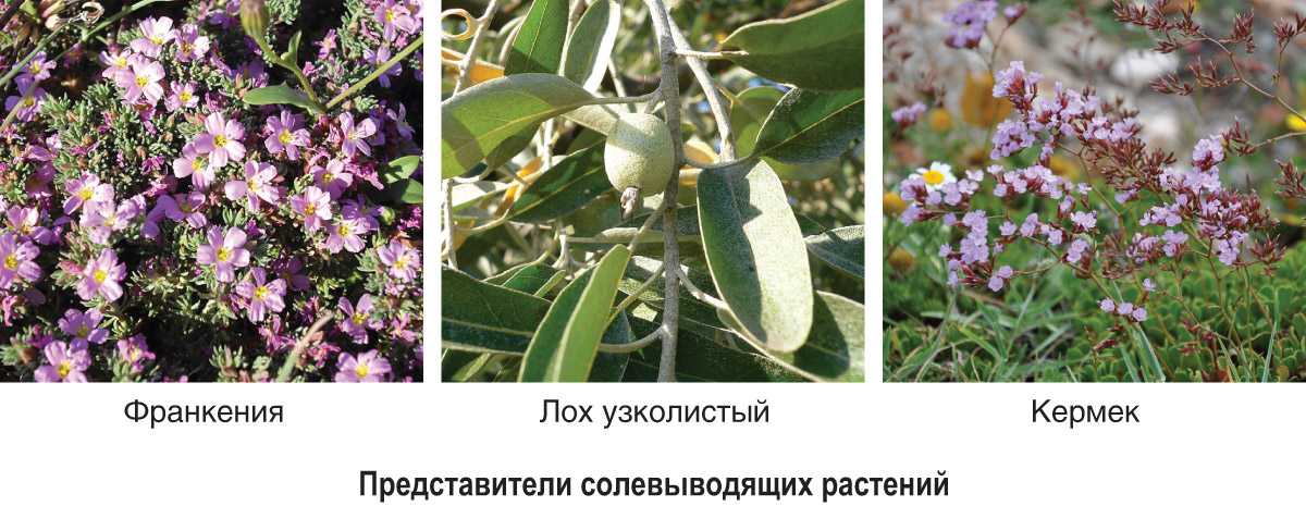 Солевыводящие растения не накапливают много солей, хотя и поглощают их довольно много. Капельки соляных растворов выходят через особые железки на листьях. Вода высыхает, а на листьях остается налет солей. Они осыпаются, их сдувает ветер или смывает дождь. Так растение освобождается от лишних солей. К солевыводящим растениям принадлежат травы франкения, кермек и кустарники — гребенщик и лох. Солевыносливые растения лучше растут на почвах, хотя бы немного засоленных, чем на незасоленных.