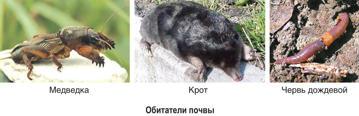 Почва состоит из твердых частиц, между которыми находятся воздух и вода. Верхний слой почвы содержит перегной, средний – вымытые из верхнего слоя вещества, а нижний – материнскую породу. В верхнем слое почвы содержится много кислорода и мало диоксида углерода, с глубиной количество O2 уменьшается, а количество СО2 возрастает. Почвенные животные имеют компактное тело и слабо развитые органы зрения. Мелкие животные (клещи, насекомые) испопользуют для передвижения коготки на лапках, средние и крупные (медведки, кроты) – копательные конечности.