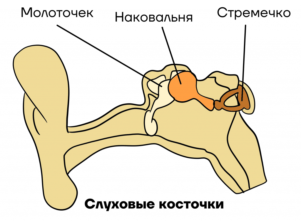 - улитку (в ней находятся волосковые клетки, которые воспринимают звуковые колебания и передают импульс на слуховой нерв).