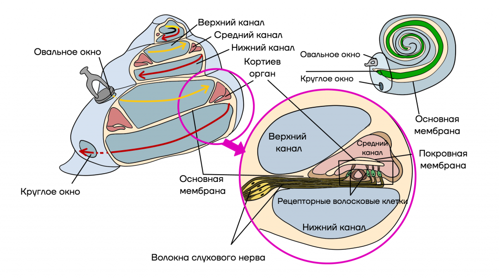 В улитке расположен кортиев орган — рецепторная часть органа слуха. Волосковые рецепторные клетки кортиева органа воспринимают колебания жидкости и генерируют нервный импульс. Улитка заполнена жидкостью: