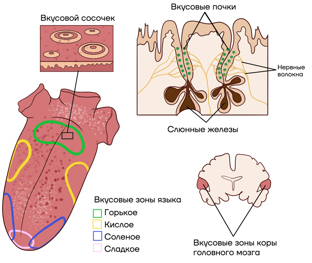 За восприятие вкуса отвечает наш язык. Если мы потрогаем пальцами соль и сахар, то не отличим их. Но стоит их поочередно положить на язык — и мы сразу определим, где сахар, а где соль. Это зависит от вкусовых сосочков — специализированных участков ротовой полости, которые находятся в маленьких бугорках на поверхности нашего языка. В каждом бугорке содержится 100—200 вкусовых сосочков.