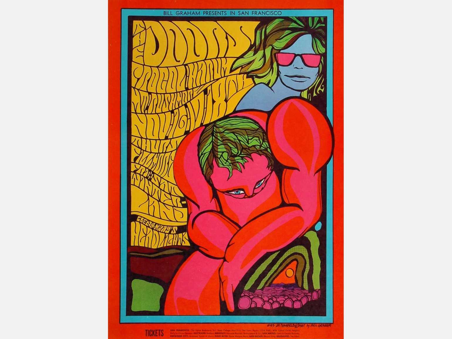 Музыканты, конкурируя за внимание слушателя, используют эксцентричные формы, шрифты, узоры, женские образы. Психоделическая культура хиппи переосмысляет модерн ― главное отличие нового «модерна» от образцов прошлого в использовании насыщенных, контрастных цветов и образов, соответствующих духу нового времени