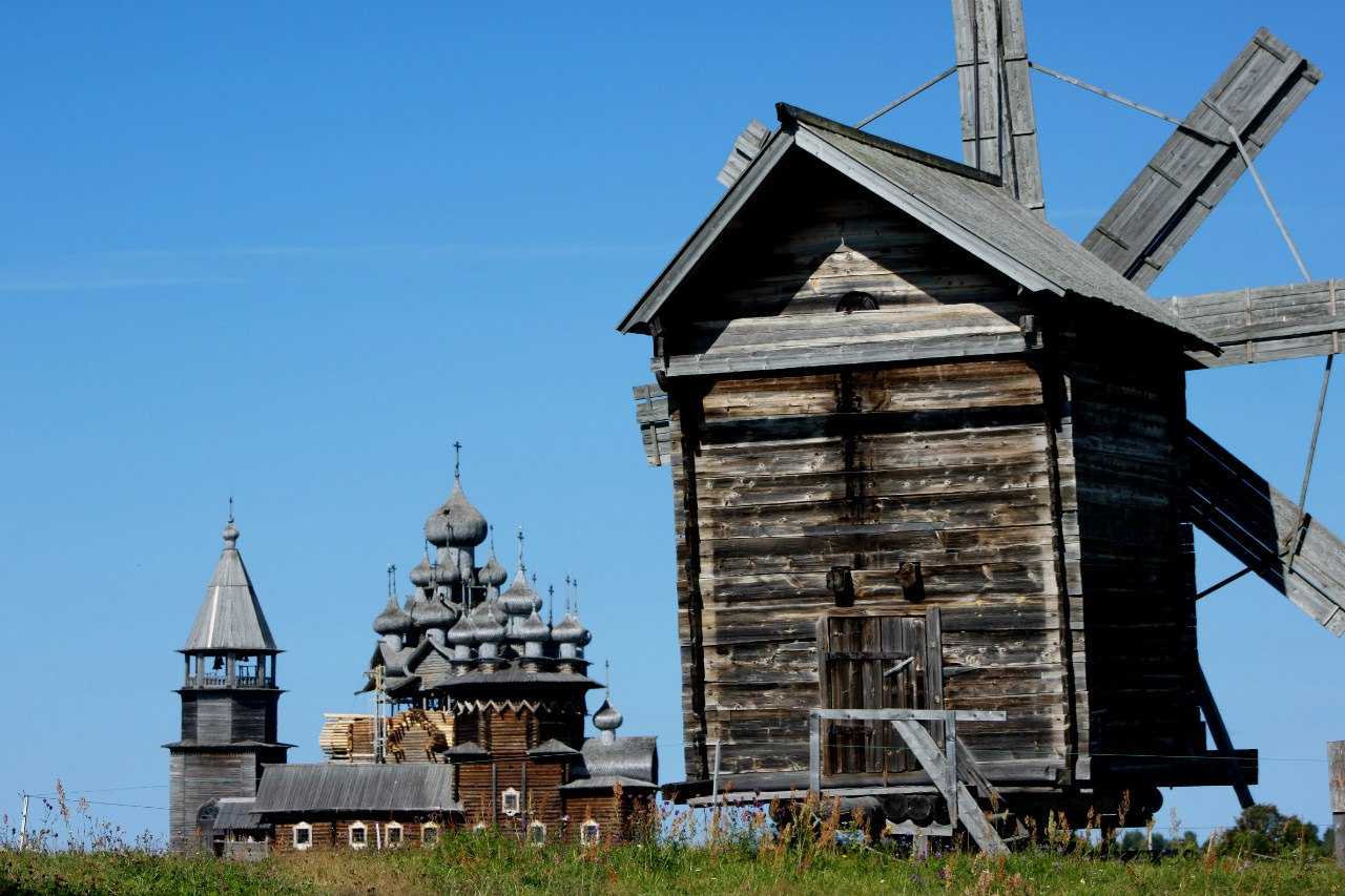 Ветряная 8-крылая мельница – архитектурно-историческая памятка, вошедшая в состав кижского музея. Была возведена в 1928-ом г. и отреставрирована в 1976-ом. Помимо этого в ансамбль включено большое число часовен, формирующих Кижское ожерелье.