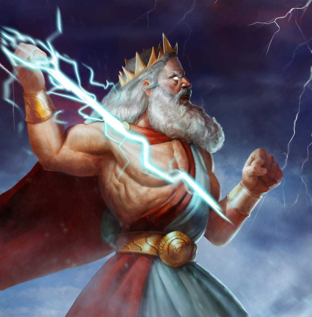 Младший сын Реи и Кроноса, считается отцом и покровителем людей и богов, олицетворял добро и зло. Он выступил против своего отца, свергнув его в Тартар. После этого власть на земле была разделена между ним и его братьями – Посейдоном и Аидом. Является покровителем молнии и грома. Его атрибутами являлся щит и топор, позднее рядом с ним начали изображать орла. Зевса любили, но и боялись его кары, поэтому подносили ценные дары.