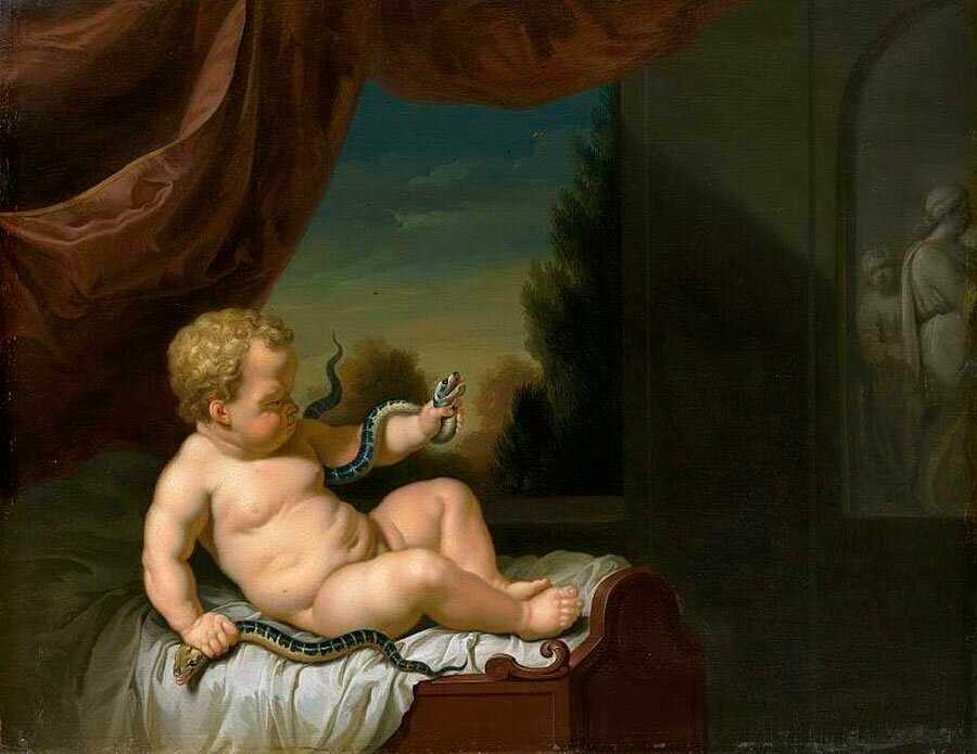 Когда Амфитрион, обмирая, заглянул в колыбель, он увидел такую картину, что просто оторопел. В колыбели лежали две огромные змеи. Они были мертвы: их толстые шеи сжимал ручонками младенец, который, безмятежно улыбаясь, спал.