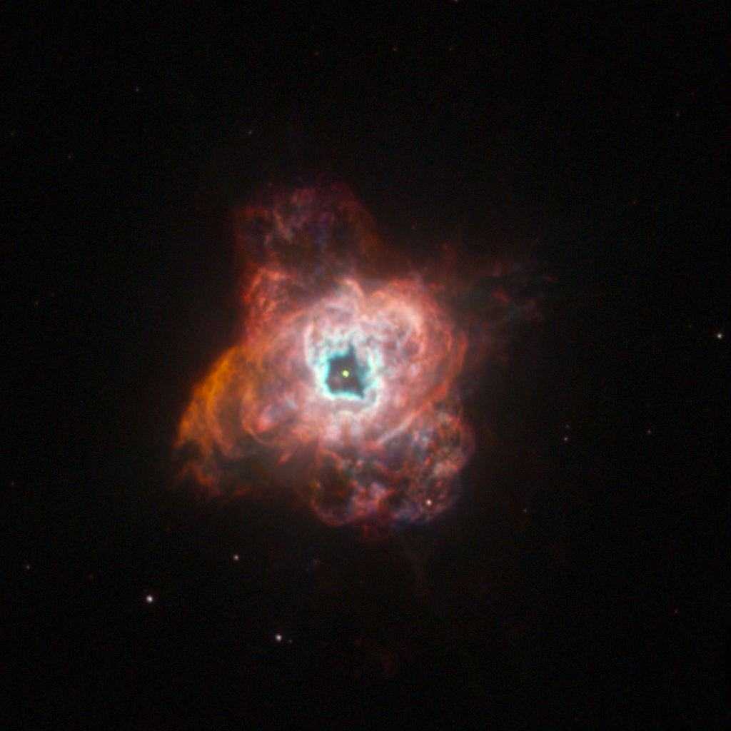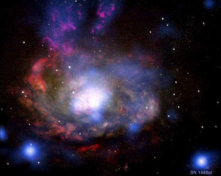 Вы смотрите на центральные участки Галактики Циркуль. Данные рентгеновской обсерватории НАСА Чандра отображены синим цветом, а от Хаббла – желтым (I-диапазон), красным (выделение водорода), голубым (V-диапазон) и светло-голубым (кислородная эмиссия). Синий огонек ближе к нижнему правому углу – сверхновая SN 1996cr, которую идентифицировали спустя 10 лет после взрыва. Впервые она отметилась в наблюдениях Чандра в 2001 году.