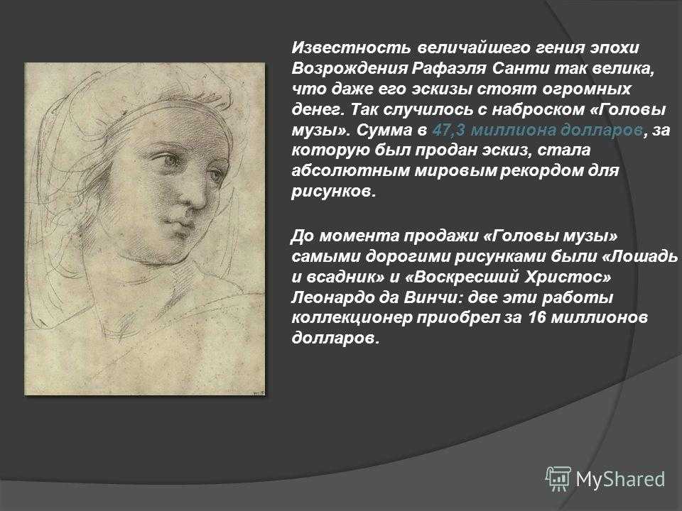 Известность величайшего гения эпохи Возрождения Рафаэля Санти так велика, что даже его эскизы стоят огромных денег. Так случилось с наброском «Головы музы». Сумма в 47,3 миллиона долларов, за которую был продан эскиз, стала абсолютным мировым рекордом для рисунков. До момента продажи «Головы музы» самыми дорогими рисунками были «Лошадь и всадник» и «Воскресший Христос» Леонардо да Винчи: две эти работы коллекционер приобрел за 16 миллионов долларов.