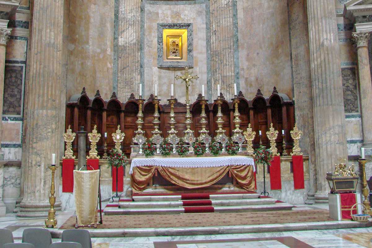 Сектор сферы над алтарным пространством гармонирует с куполом, словно земное отражение небес. В красочных портиках скульптуры бывших божеств, символизирующих известные людям планеты, заменили статуи христианских святых. На удивление хорошо сохранился красочный пол из мраморных плит, несмотря на ежедневные службы и толпы туристов. Алтарь оборудован в католических традициях, с красочными подсвечниками и распятием. Титульная икона Святой Марии в подсвеченной нише невелика, но впечатляет.