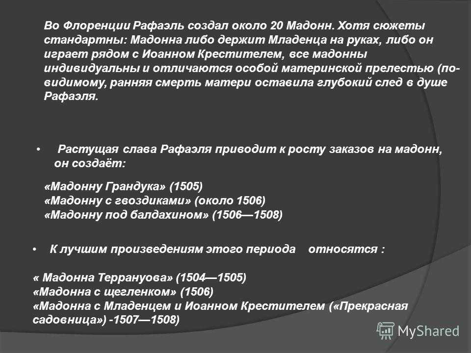 Во Флоренции Рафаэль создал около 20 Мадонн. Хотя сюжеты стандартны: Мадонна либо держит Младенца на руках, либо он играет рядом с Иоанном Крестителем, все мадонны индивидуальны и отличаются особой материнской прелестью (по- видимому, ранняя смерть матери оставила глубокий след в душе Рафаэля. Растущая слава Рафаэля приводит к росту заказов на мадонн, он создаёт: «Мадонну Грандука» (1505) «Мадонну с гвоздиками» (около 1506) «Мадонну под балдахином» ( ) К лучшим произведениям этого периода относятся : « Мадонна Террануова» ( ) «Мадонна с щегленком» (1506) «Мадонна с Младенцем и Иоанном Крестителем («Прекрасная садовница») )