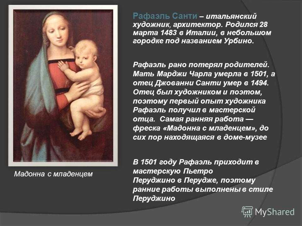 Рафаэль Санти – итальянский художник, архитектор. Родился 28 марта 1483 в Италии, в небольшом городке под названием Урбино. Рафаэль рано потерял родителей. Мать Марджи Чарла умерла в 1501, а отец Джованни Санти умер в Отец был художником и поэтом, поэтому первый опыт художника Рафаэль получил в мастерской отца. Самая ранняя работа фреска «Мадонна с младенцем», до сих пор находящаяся в доме-музее В 1501 году Рафаэль приходит в мастерскую Пьетро Перуджино в Перудже, поэтому ранние работы выполнены в стиле Перуджино Мадонна с младенцем