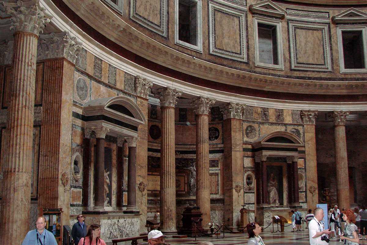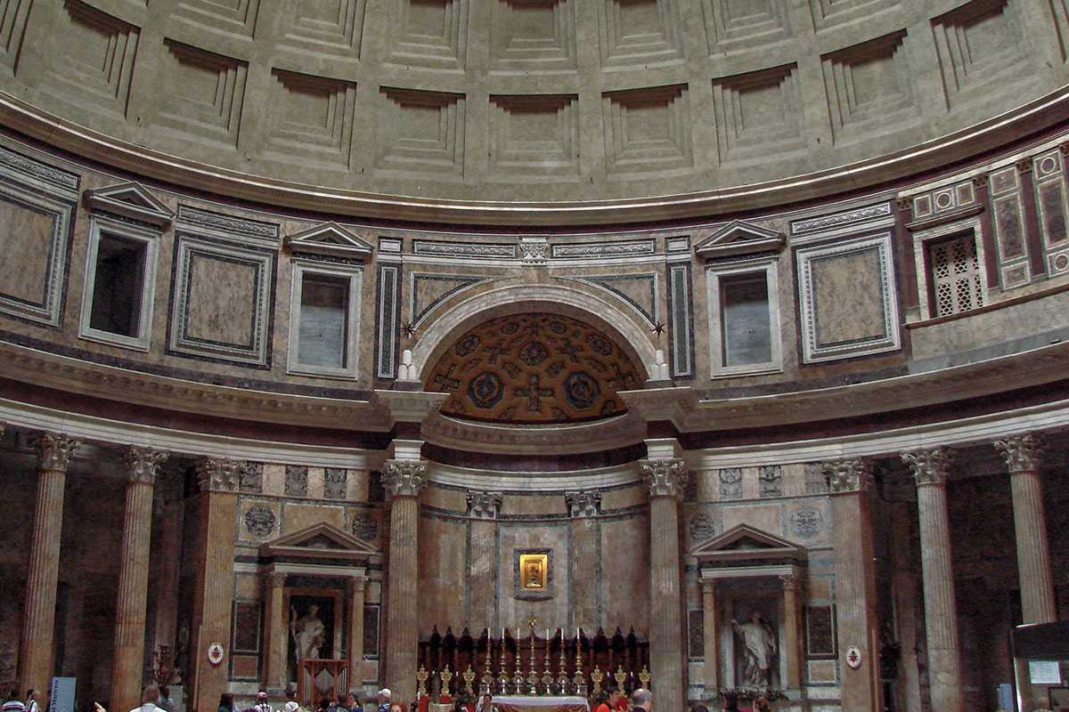 Именно внутри Пантеон в Риме изменился более всего после передачи христианам. Центральный жертвенник мифических богов древности убрали, как и их статуи из стенных ниш. Алтарь христианского облика оборудовали по канонам, на востоке, в круглом зале это несущественная переделка. Основным материалом внутреннего декорирования был и остался мрамор приятного кофейного оттенка с темными прожилками. Колонны использованы как круглые с желобками и кучерявыми коринфскими капителями, так и квадратные.