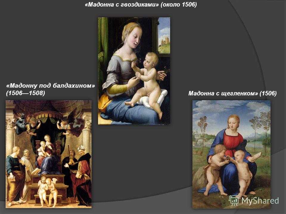 «Мадонну под балдахином» ( ) Мадонна с щегленком» (1506) «Мадонна с гвоздиками» (около 1506)