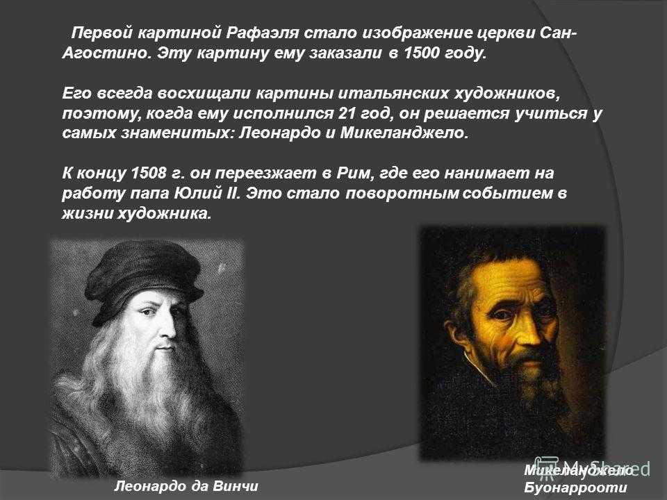 Первой картиной Рафаэля стало изображение церкви Сан- Агостино. Эту картину ему заказали в 1500 году. Его всегда восхищали картины итальянских художников, поэтому, когда ему исполнился 21 год, он решается учиться у самых знаменитых: Леонардо и Микеланджело. К концу 1508 г. он переезжает в Рим, где его нанимает на работу папа Юлий II. Это стало поворотным событием в жизни художника. Леонардо да Винчи Микеланджело Буонаррооти