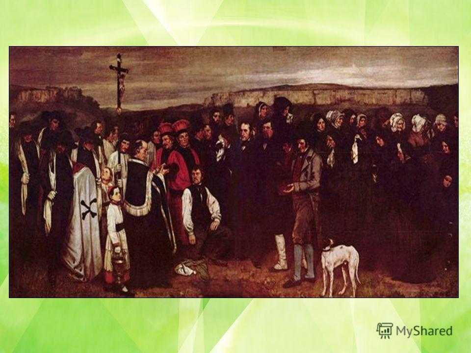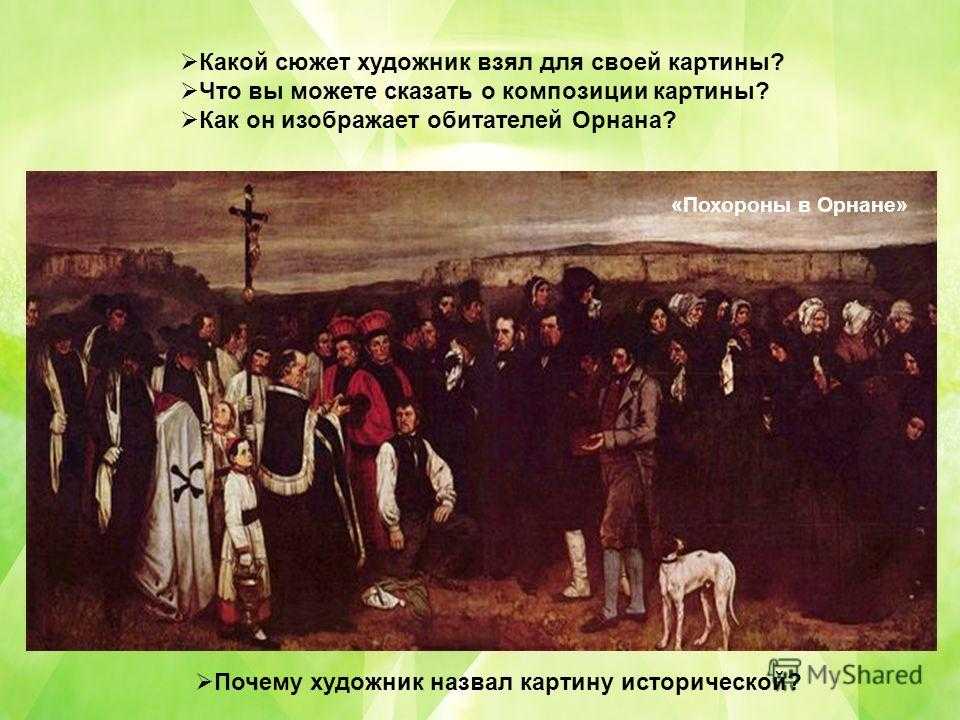 Какой сюжет художник взял для своей картины? Что вы можете сказать о композиции картины? Как он изображает обитателей Орнана? Почему художник назвал картину исторической? «Похороны в Орнане»