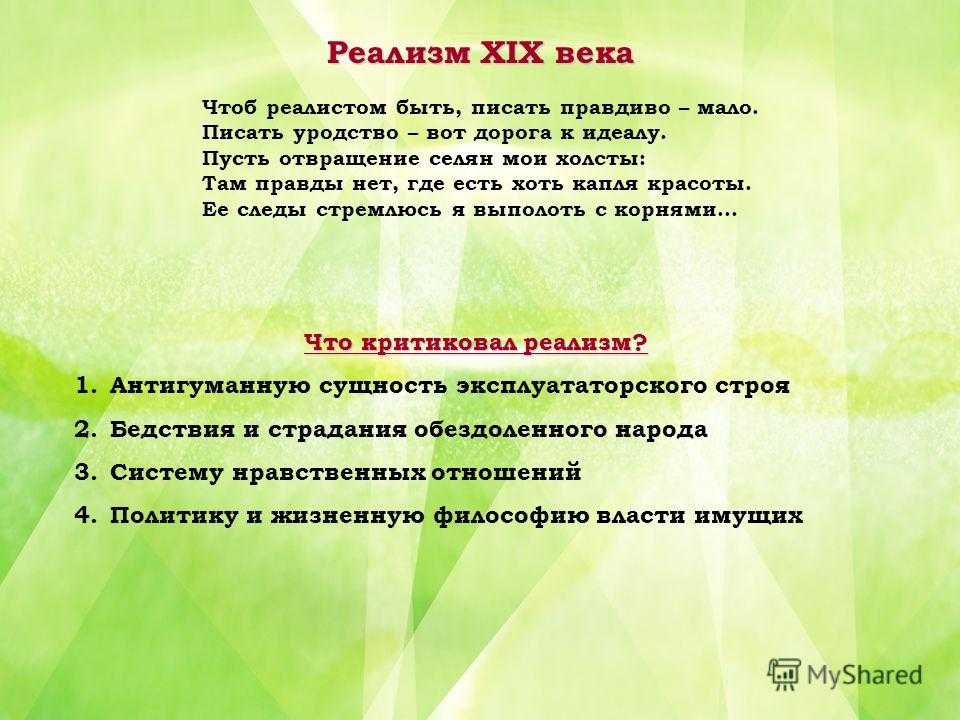 Реализм XIX века Чтоб реалистом быть, писать правдиво – мало. Писать уродство – вот дорога к идеалу. Пусть отвращение селян мои холсты: Там правды нет, где есть хоть капля красоты. Ее следы стремлюсь я выполоть с корнями… Что критиковал реализм? 1. Антигуманную сущность эксплуататорского строя 2. Бедствия и страдания обездоленного народа 3. Систему нравственных отношений 4. Политику и жизненную философию власти имущих