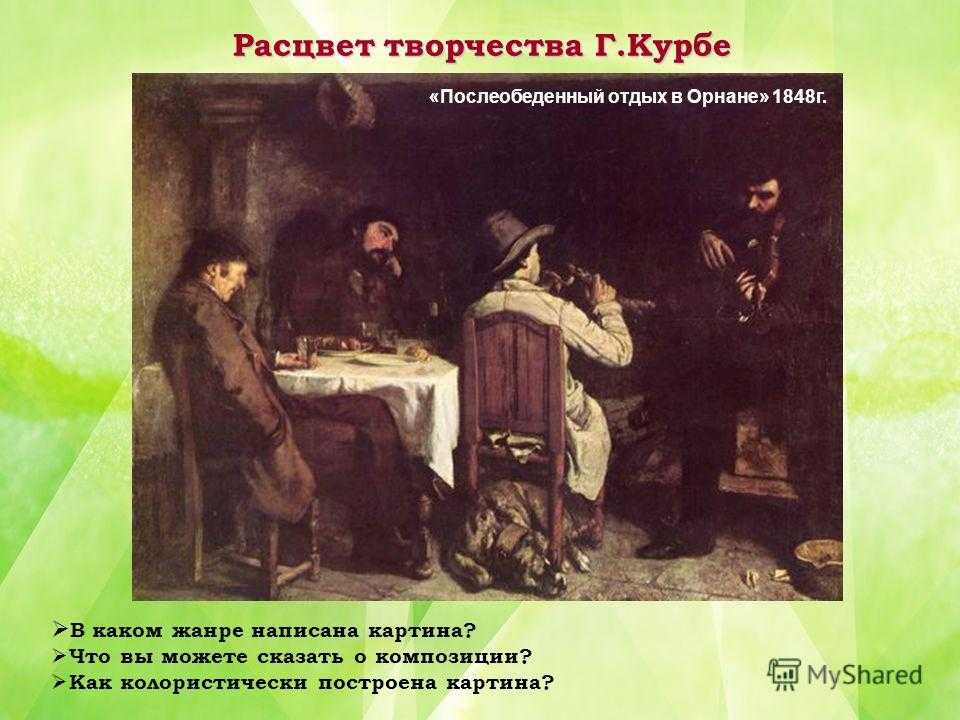 Расцвет творчества Г.Курбе В каком жанре написана картина? Что вы можете сказать о композиции? Как колористически построена картина? «Послеобеденный отдых в Орнане» 1848 г.