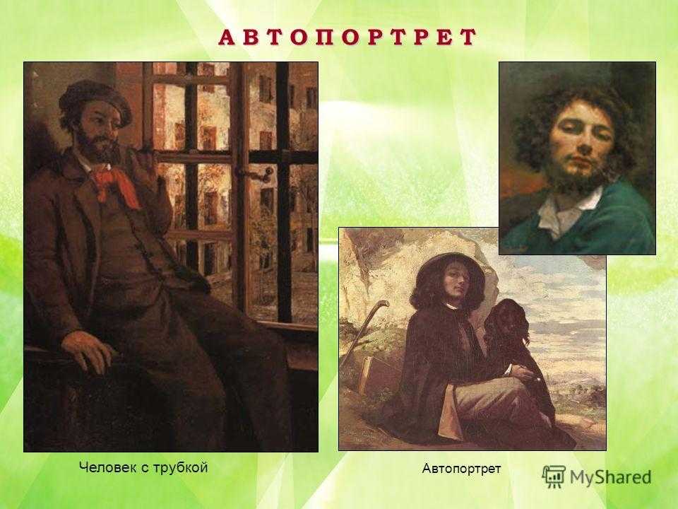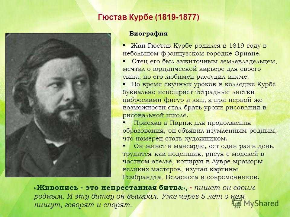 Гюстав Курбе ( ) Биография Жан Гюстав Курбе родился в 1819 году в небольшом французском городке Орнане. Отец его был зажиточным землевладельцем, мечтал о юридической карьере для своего сына, но его любимец рассудил иначе. Во время скучных уроков в колледже Курбе буквально испещряет тетрадные листки набросками фигур и лиц, а при первой же возможности стал брать уроки рисования в рисовальной школе. Приехав в Париж для продолжения образования, он объявил изумленным родным, что намерен стать художником. Он живет в мансарде, ест один раз в день, трудится как поденщик, рисуя с моделей в частном ателье, копируя в Лувре мраморы великих мастеров, изучая картины Рембрандта, Веласкеса и современников. «Живопись — это непрестанная битва», — пишет он своим родным. И эту битву он выиграл. Уже через 5 лет о нем пишут, говорят и спорят.