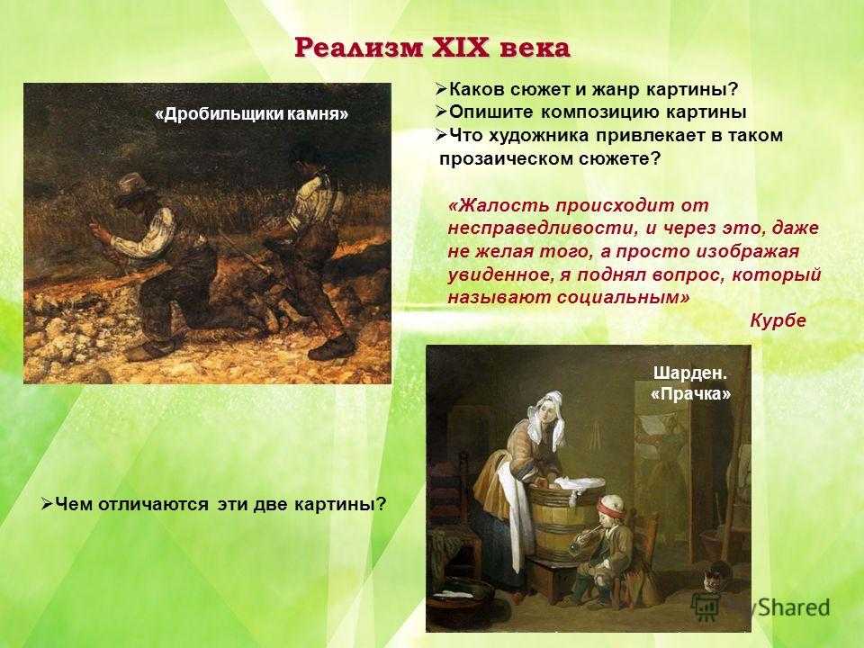 Реализм XIX века «Дробильщики камня» Каков сюжет и жанр картины? Опишите композицию картины Что художника привлекает в таком прозаическом сюжете? «Жалость происходит от несправедливости, и через это, даже не желая того, а просто изображая увиденное, я поднял вопрос, который называют социальным» Курбе Шарден. «Прачка» Чем отличаются эти две картины?