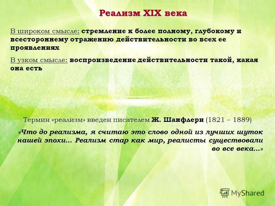Реализм XIX века В широком смысле: стремление к более полному, глубокому и всестороннему отражению действительности во всех ее проявлениях В узком смысле: воспроизведение действительности такой, какая она есть Термин «реализм» введен писателем Ж. Шанфлери (1821 – 1889) «Что до реализма, я считаю это слово одной из лучших шуток нашей эпохи… Реализм стар как мир, реалисты существовали во все века…»