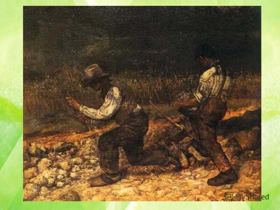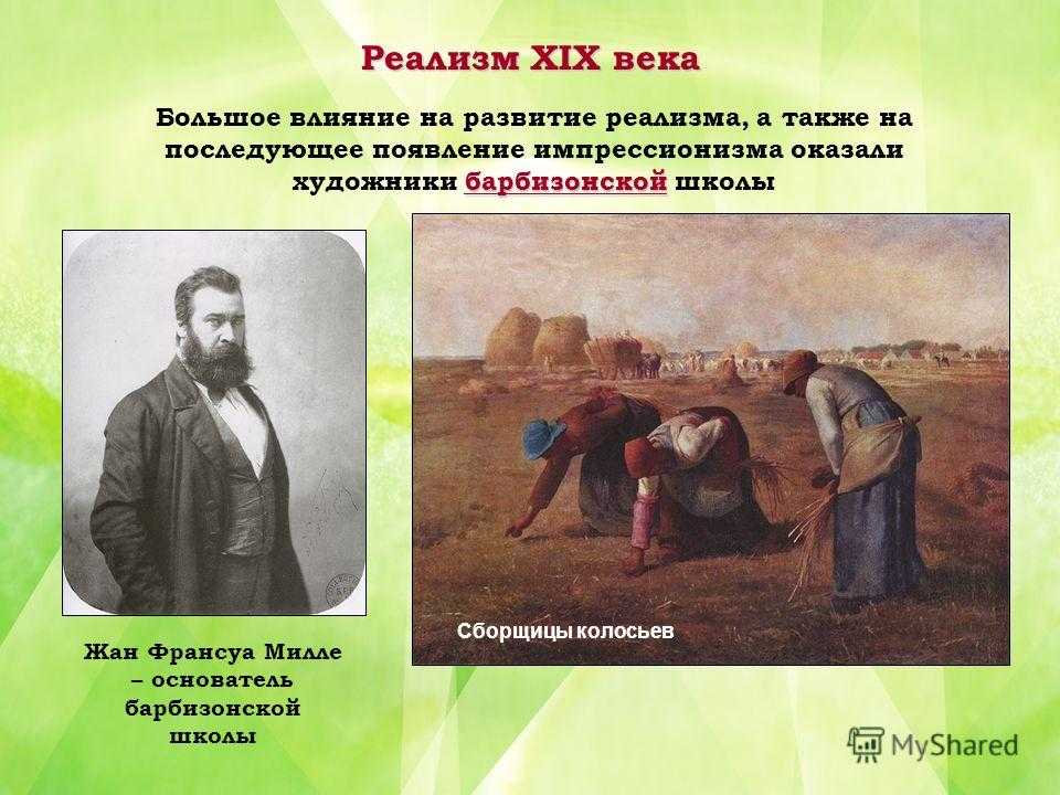 Реализм XIX века барбизонской Большое влияние на развитие реализма, а также на последующее появление импрессионизма оказали художники барбизонской школы Жан Франсуа Милле – основатель барбизонской школы Сборщицы колосьев