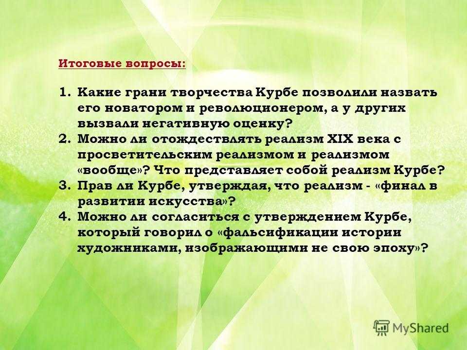 Итоговые вопросы: 1. Какие грани творчества Курбе позволили назвать его новатором и революционером, а у других вызвали негативную оценку? 2. Можно ли отождествлять реализм XIX века с просветительским реализмом и реализмом «вообще»? Что представляет собой реализм Курбе? 3. Прав ли Курбе, утверждая, что реализм — «финал в развитии искусства»? 4. Можно ли согласиться с утверждением Курбе, который говорил о «фальсификации истории художниками, изображающими не свою эпоху»?