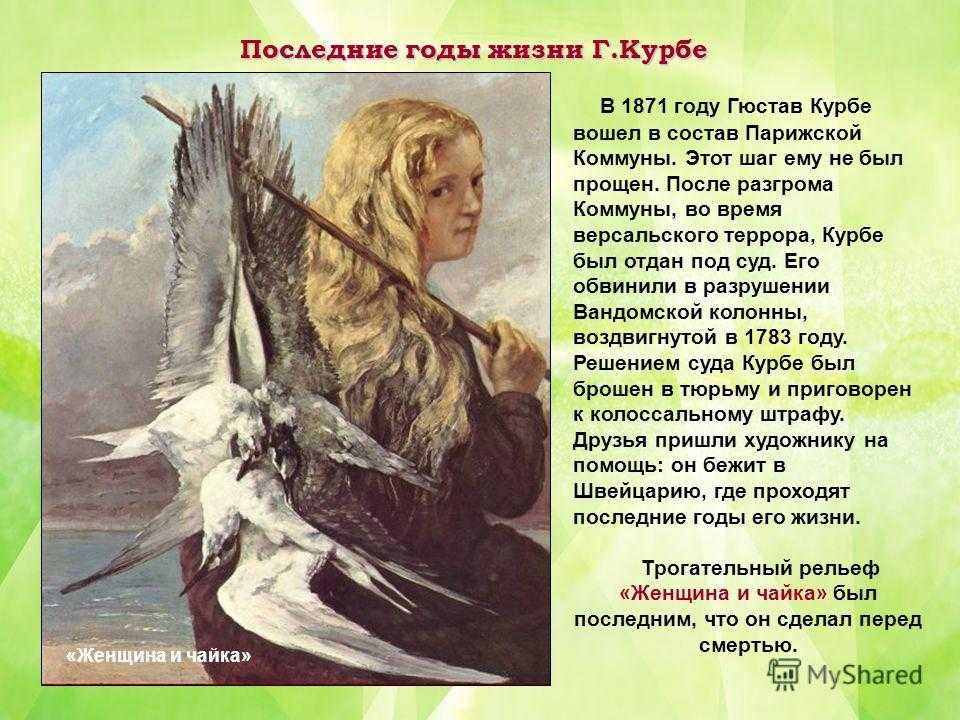 Последние годы жизни Г.Курбе В 1871 году Гюстав Курбе вошел в состав Парижской Коммуны. Этот шаг ему не был прощен. После разгрома Коммуны, во время версальского террора, Курбе был отдан под суд. Его обвинили в разрушении Вандомской колонны, воздвигнутой в 1783 году. Решением суда Курбе был брошен в тюрьму и приговорен к колоссальному штрафу. Друзья пришли художнику на помощь: он бежит в Швейцарию, где проходят последние годы его жизни. Трогательный рельеф «Женщина и чайка» был последним, что он сделал перед смертью. «Женщина и чайка»