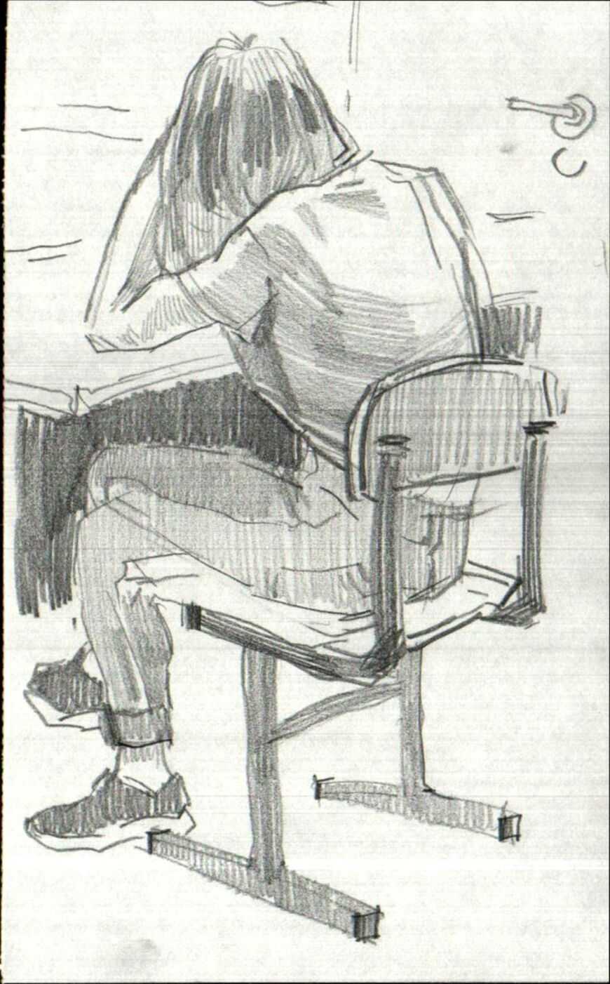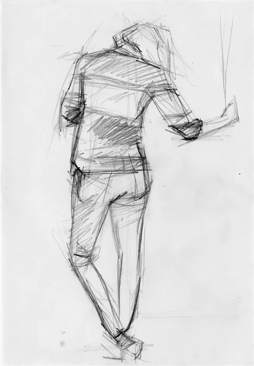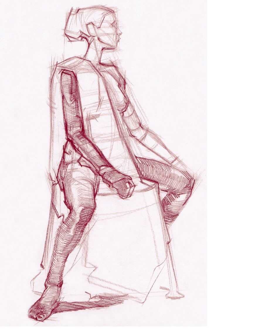 В этом случае фигура сидит на стуле, слегка наклоняясь вперед и влево, и смотрит на землю. Одна нога выдвигается вперед, а одна сгибается назад. Это движение можно описать проще всего, нарисовав широкую кривую, которая начинается с головы и при этом обе кривые линии проходят вокруг туловища и одна из линий продолжает связывать туловище с подошвой стопы