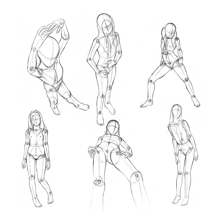 Когда это движение нарисовано, тогда становится реальным найти угол плеч, форму головы и конец торса. Руки и ноги первоначально могут быть указаны строками.