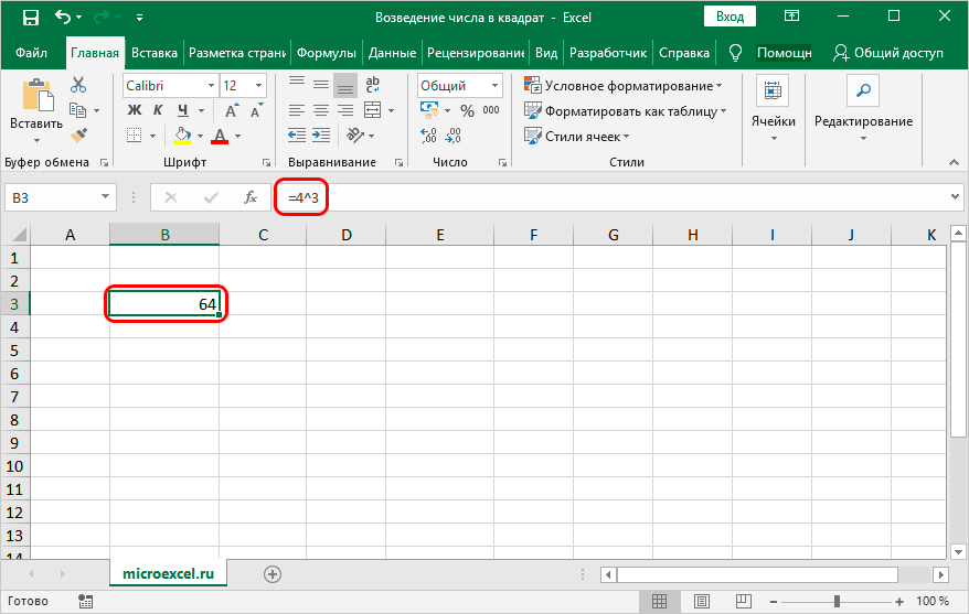 Примечание: данная формула применима не только для возведения числа в квадрат, но и в другие степени. В этом случае вместо цифры 2 мы пишем другую желаемую цифру. Например, формула “=4^3” возведет число 4 в третью степень или, другими словами, в куб.