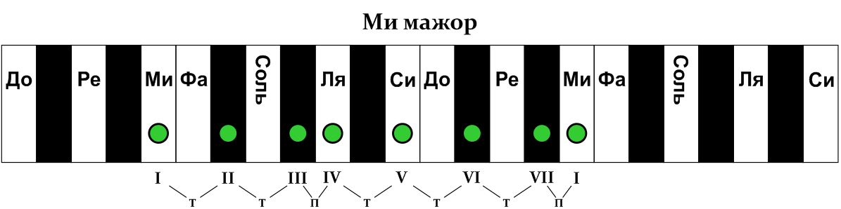 А вот здесь уже интереснее. Некоторые ступени лада попали на производные ступени звукоряда, на черные клавиши. Получается что в тональность Ми-мажор входят звуки: Ми, Фа-диез, Соль-диез, Ля, Си, До-диез, Ре-диез.