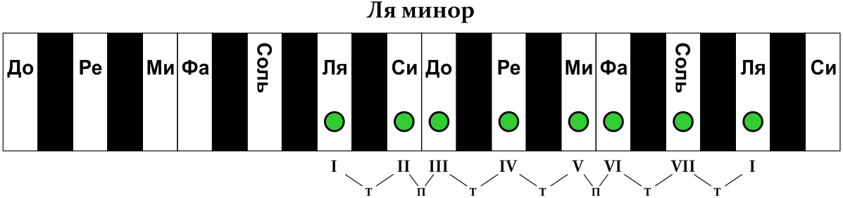 Поясню на примере. Давайте построим тональность Ля-минор. Если мы помним структуру минорного лада (Т,П,Т,Т,П,Т,Т), то это будет легко: