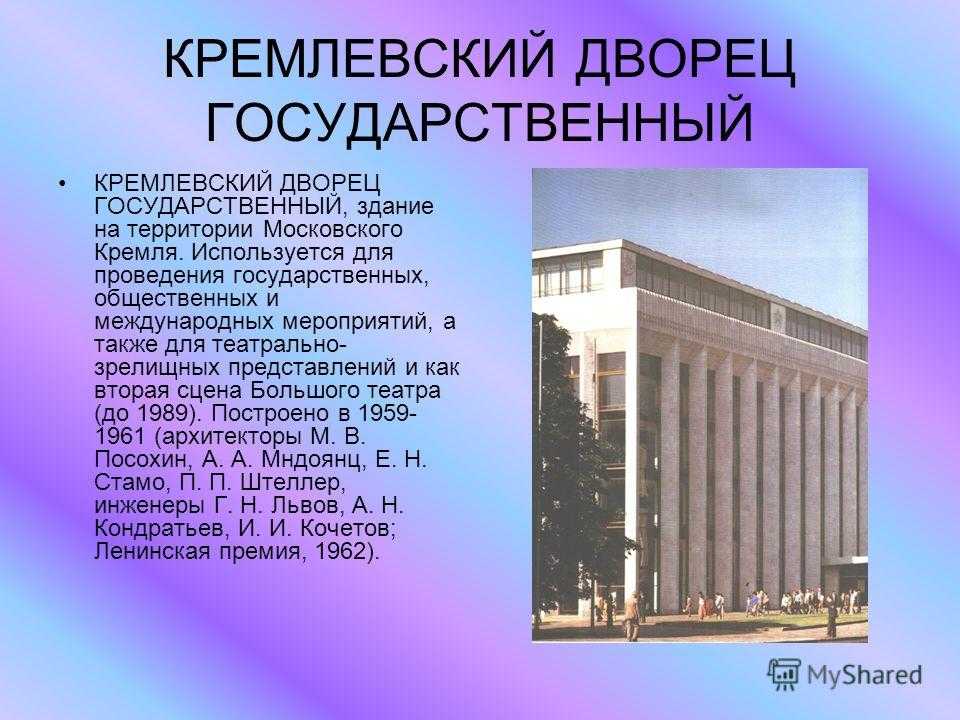 КРЕМЛЕВСКИЙ ДВОРЕЦ ГОСУДАРСТВЕННЫЙ КРЕМЛЕВСКИЙ ДВОРЕЦ ГОСУДАРСТВЕННЫЙ, здание на территории Московского Кремля. Используется для проведения государственных, общественных и международных мероприятий, а также для театрально- зрелищных представлений и как вторая сцена Большого театра (до 1989). Построено в (архитекторы М. В. Посохин, А. А. Мндоянц, Е. Н. Стамо, П. П. Штеллер, инженеры Г. Н. Львов, А. Н. Кондратьев, И. И. Кочетов; Ленинская премия, 1962).