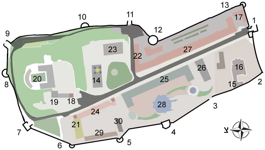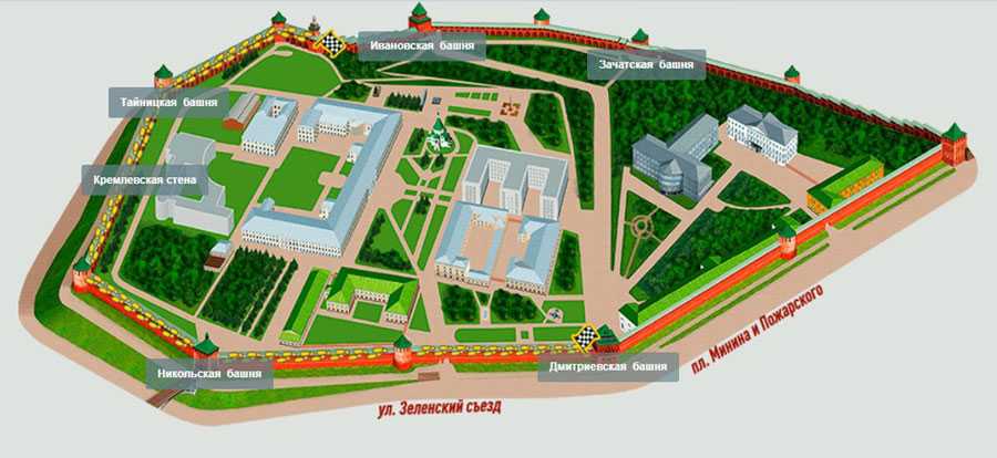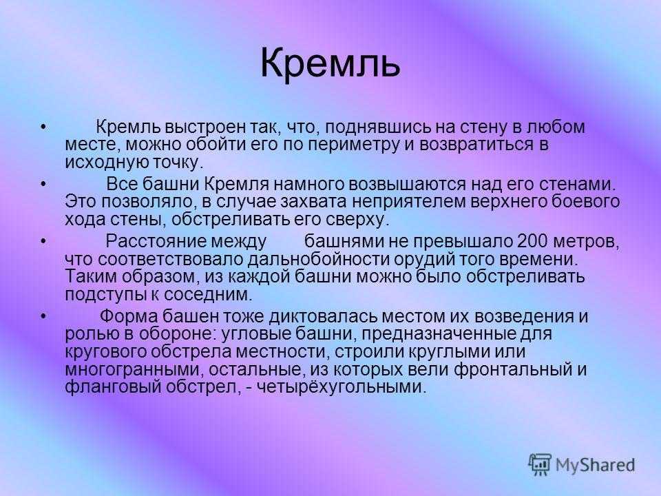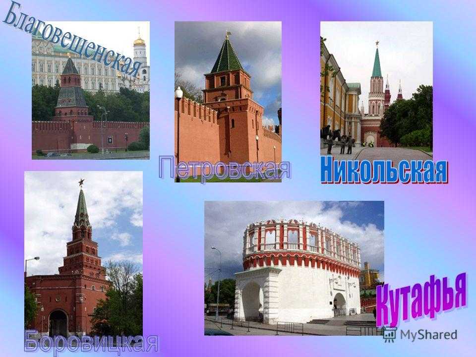Кремль Кремль выстроен так, что, поднявшись на стену в любом месте, можно обойти его по периметру и возвратиться в исходную точку. Все башни Кремля намного возвышаются над его стенами. Это позволяло, в случае захвата неприятелем верхнего боевого хода стены, обстреливать его сверху. Расстояние между башнями не превышало 200 метров, что соответствовало дальнобойности орудий того времени. Таким образом, из каждой башни можно было обстреливать подступы к соседним. Форма башен тоже диктовалась местом их возведения и ролью в обороне: угловые башни, предназначенные для кругового обстрела местности, строили круглыми или многогранными, остальные, из которых вели фронтальный и фланговый обстрел, — четырёхугольными.