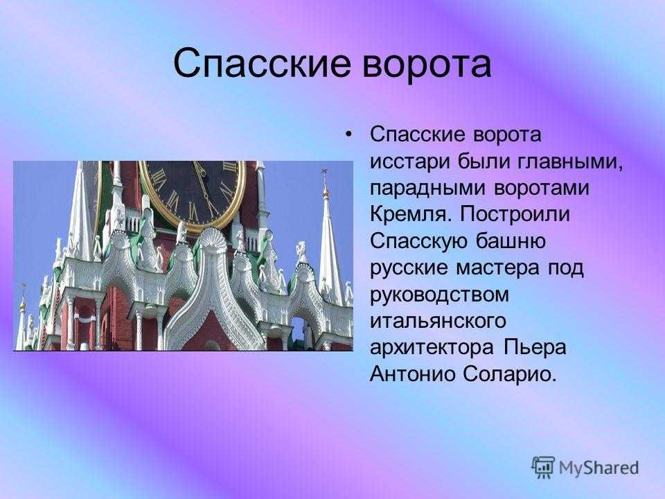 Спасские ворота Спасские ворота исстари были главными, парадными воротами Кремля. Построили Спасскую башню русские мастера под руководством итальянского архитектора Пьера Антонио Соларио.