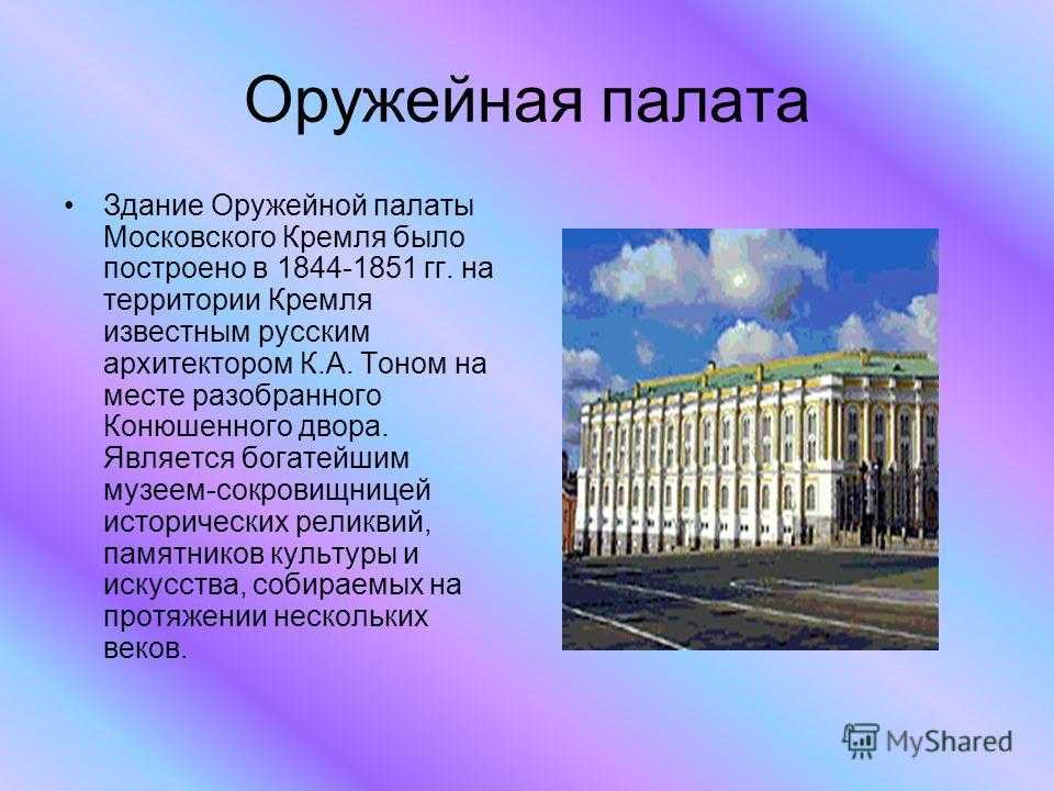 Оружейная палата Здание Оружейной палаты Московского Кремля было построено в гг. на территории Кремля известным русским архитектором К.А. Тоном на месте разобранного Конюшенного двора. Является богатейшим музеем-сокровищницей исторических реликвий, памятников культуры и искусства, собираемых на протяжении нескольких веков.