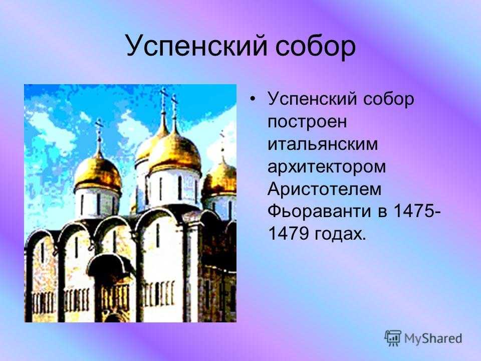 Успенский собор Успенский собор построен итальянским архитектором Аристотелем Фьораванти в годах.