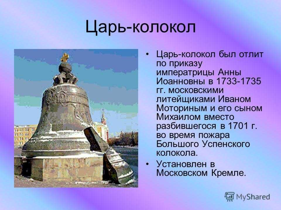 Царь-колокол Царь-колокол был отлит по приказу императрицы Анны Иоанновны в гг. московскими литейщиками Иваном Моториным и его сыном Михаилом вместо разбившегося в 1701 г. во время пожара Большого Успенского колокола. Установлен в Московском Кремле.