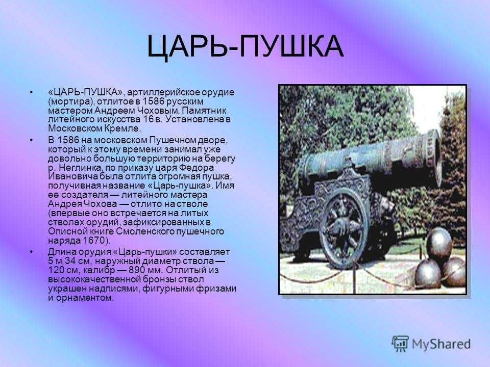 ЦАРЬ-ПУШКА «ЦАРЬ-ПУШКА», артиллерийское орудие (мортира), отлитое в 1586 русским мастером Андреем Чоховым. Памятник литейного искусства 16 в. Установлена в Московском Кремле. В 1586 на московском Пушечном дворе, который к этому времени занимал уже довольно большую территорию на берегу р. Неглинка, по приказу царя Федора Ивановича была отлита огромная пушка, получивная название «Царь-пушка». Имя ее создателя литейного мастера Андрея Чохова отлито на стволе (впервые оно встречается на литых стволах орудий, зафиксированных в Описной книге Смоленского пушечного наряда 1670). Длина орудия «Царь-пушки» составляет 5 м 34 см, наружный диаметр ствола 120 см, калибр 890 мм. Отлитый из высококачественной бронзы ствол украшен надписями, фигурными фризами и орнаментом.