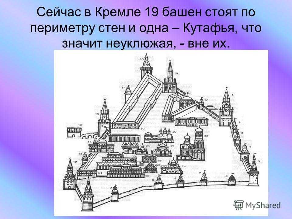 Сейчас в Кремле 19 башен стоят по периметру стен и одна – Кутафья, что значит неуклюжая, — вне их.
