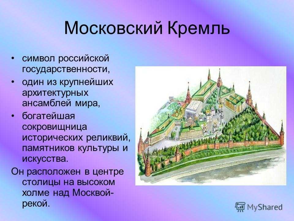 Московский Кремль символ российской государственности, один из крупнейших архитектурных ансамблей мира, богатейшая сокровищница исторических реликвий, памятников культуры и искусства. Он расположен в центре столицы на высоком холме над Москвой- рекой.