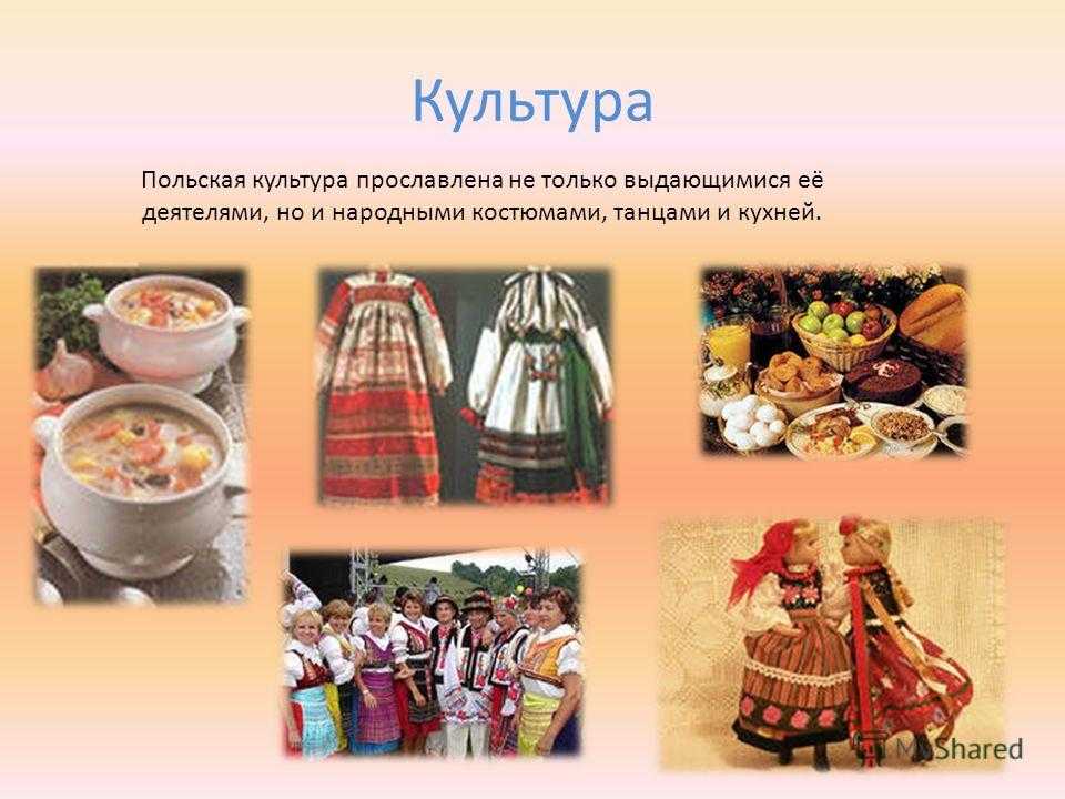 Культура Польская культура прославлена не только выдающимися её деятелями, но и народными костюмами, танцами и кухней.
