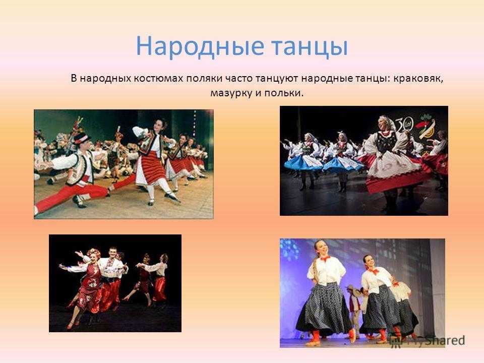 Народные танцы В народных костюмах поляки часто танцуют народные танцы: краковяк, мазурку и польки.